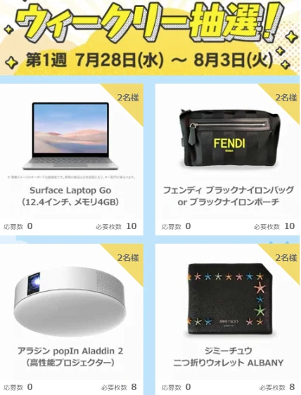 ウィークリー抽選で最大10万円の豪華賞品が180名に当たります。